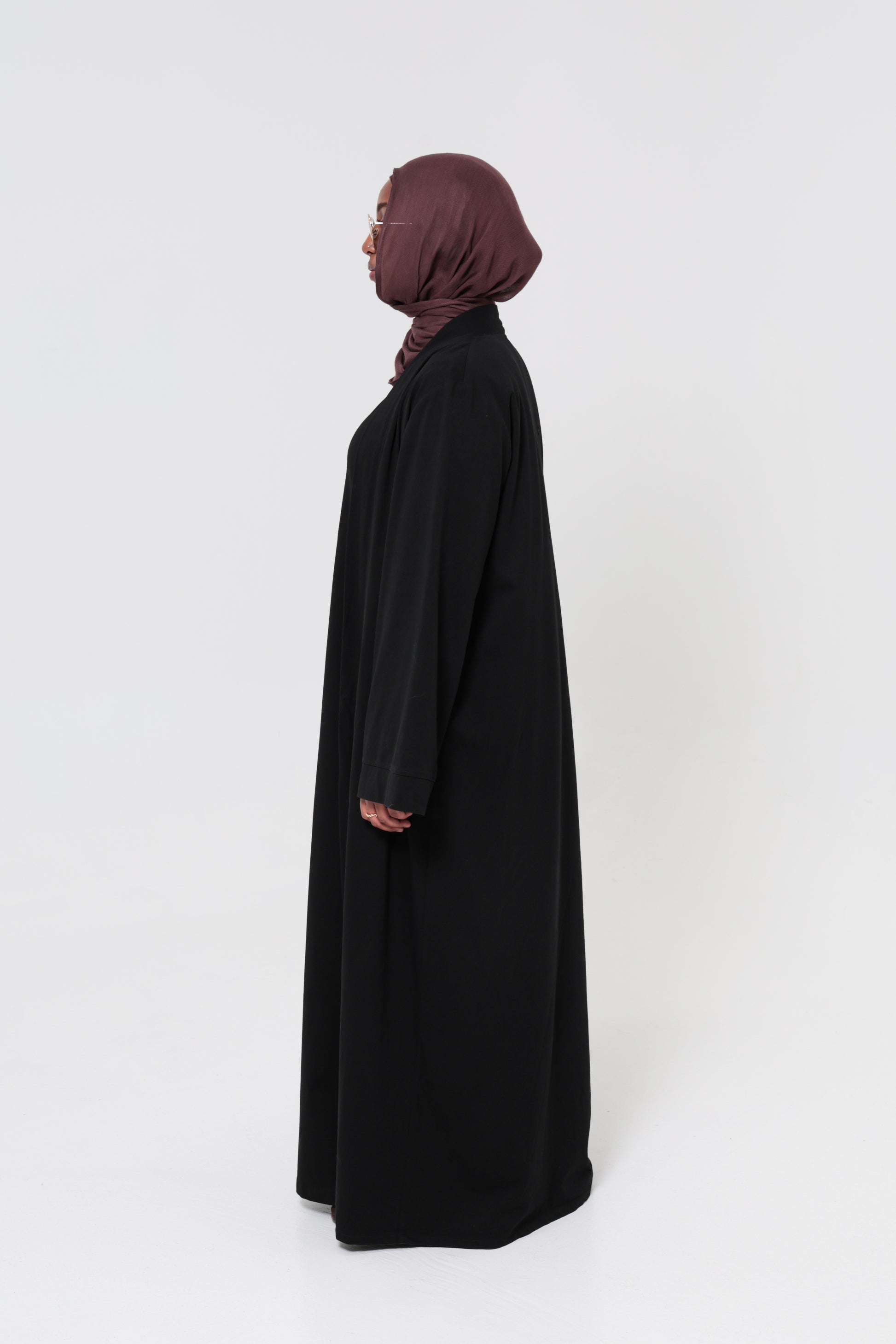 The outer abayah features discreet side pockets and our signature logo embroidery on the sleeve for a refined touch. The inner dress is designed with classic t-shirt sleeves for effortless layering and comfort. A three-layer folded bottom hem adds subtle weight and structure, allowing the abayah to be lengthened if desired.